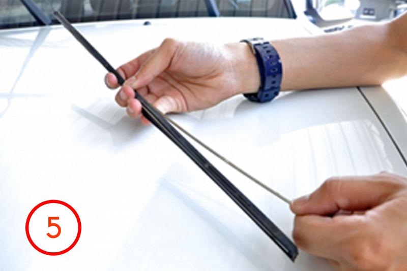 7. สอดเส้นเหล็กเข้าไปในยางปัดน้ำฝน (ร่องบนสุดของยาง)