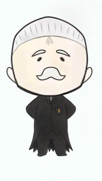 ผมหันไปทางที่มาของเสียง ที่ตรงนั้นมีชายแก่คนหนึ่งยืนอยู่ ส่วนสูงของเขาเตี้ยจนน่าตกใจ เขาดูอายุประมาณน่าจะราวๆหกสิบปีหรือมากกว่านั้น ทรงผมสีขาวที่ถูกจัดอย่างเป็นระเบียบ ทำให้นึกถึงพวกขุนนางในวังที่มักจะเสยผมไปข้างหลังให้ดูเรียบเข้าไว้ หนวดของเขาปลายทั้งสองข้างม้วนขึ้นอย่างแปลกตา ทว่าหน้าตาของเขาดูเป็นคุณปู่ใจดีที่ให้ความรู้สึกไว้วางใจได้ สวมชุดดูสุภาพเหมือนกับพ่อบ้านยังไงอย่างงั้น